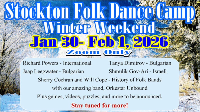 On Friday, January 30, instead of our usual Friday dance, we will be joining (and leading a portion of) the Stockton Winter Weekend Friday Evening Party. So, the time and the Zoom link will be different than usual. The Zoom link will be the one that's used for the Global Folk Dance Parties, so if you're already registered for those, you'll be all set. If not, here's the registration link:
